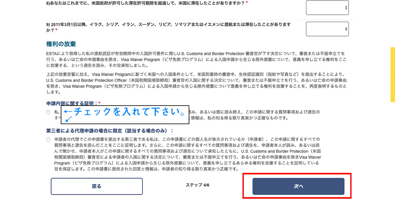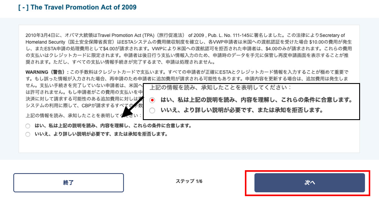 「The Travel Promotion Act of 2009」をチェックしたら、「次へ」