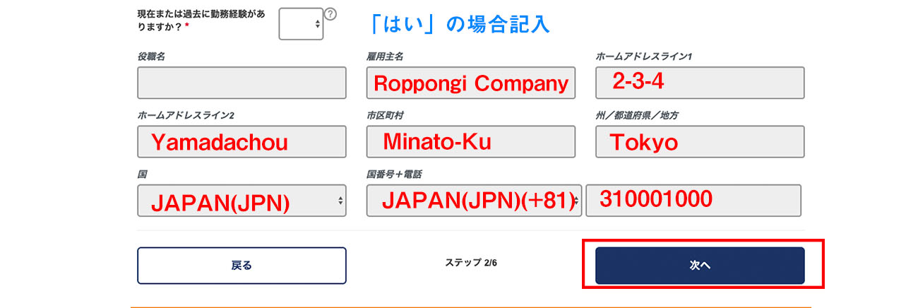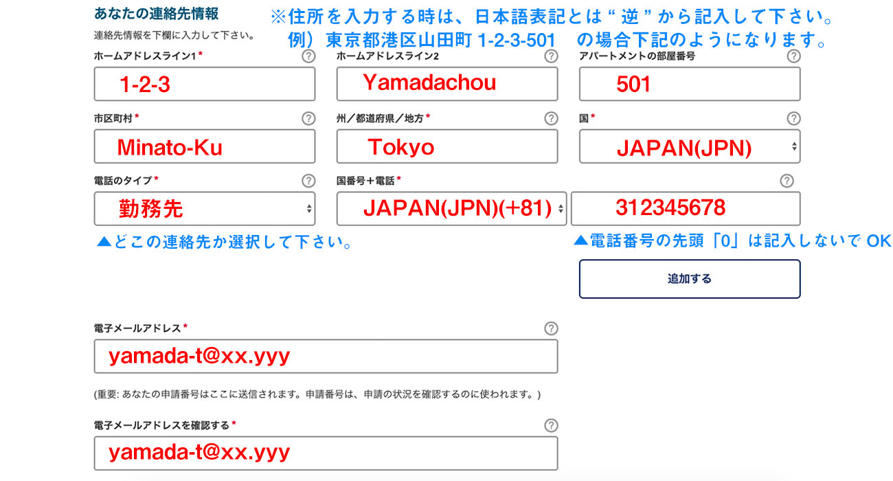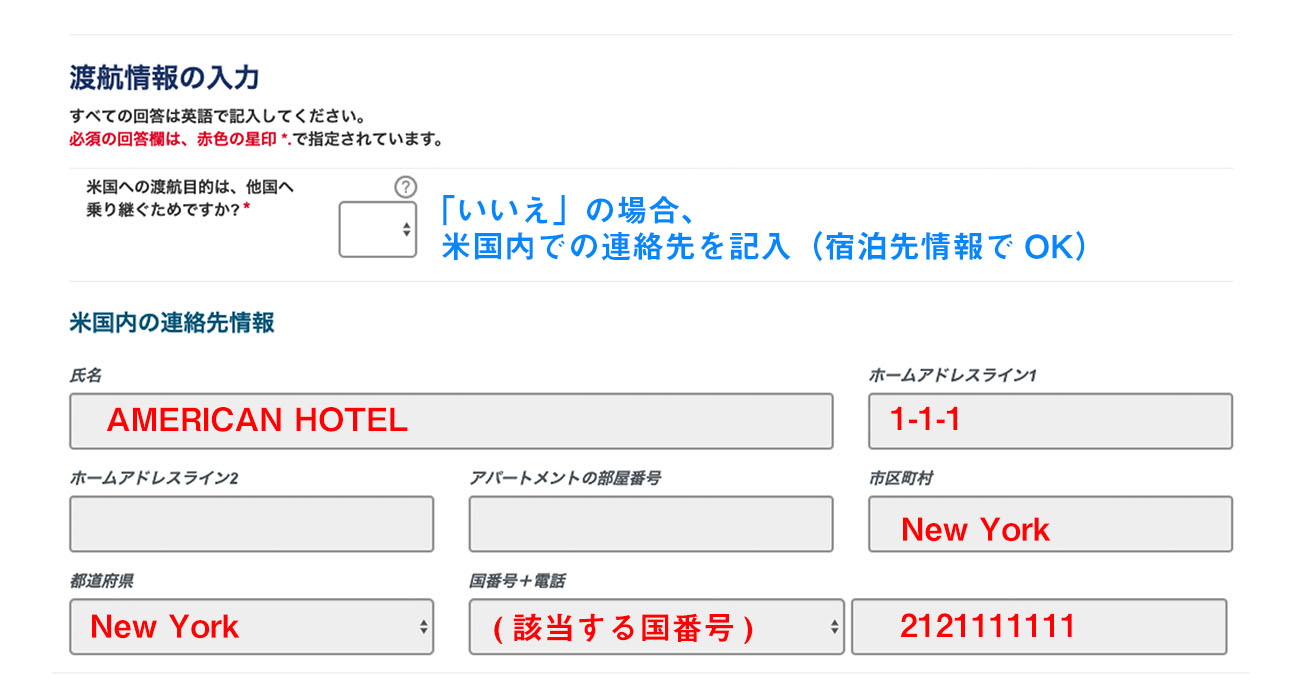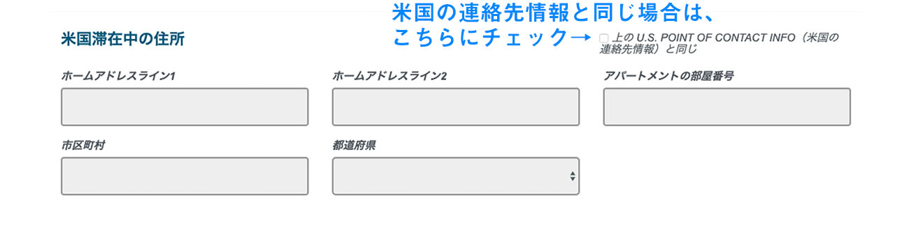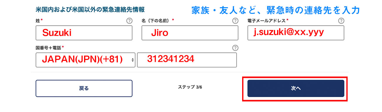 米国滞在中の住所、緊急連絡先を入力して、「次へ」