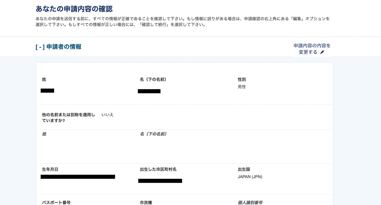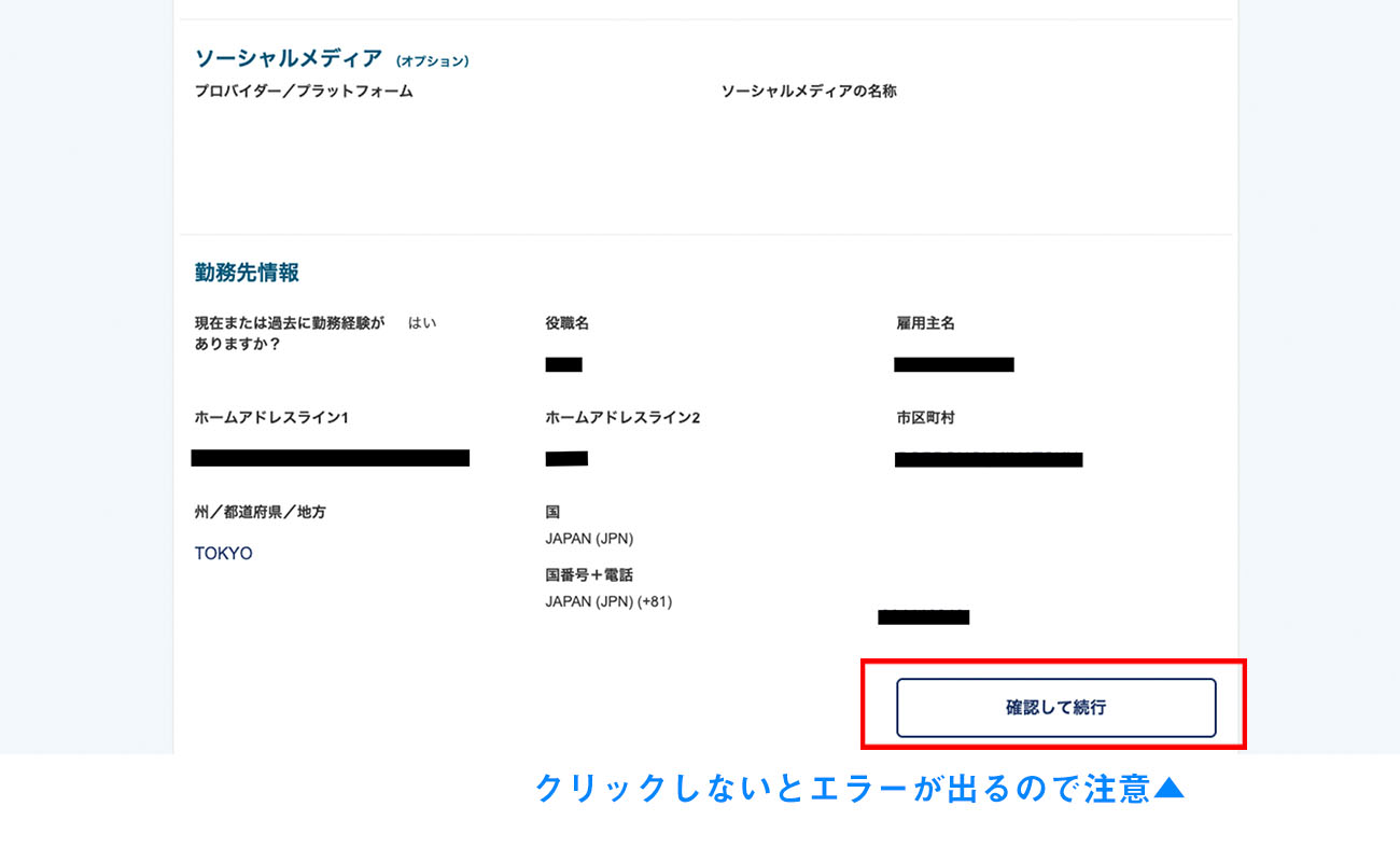 申請内容を確認出来たら、項目ごとに「確認して続行」ボタンをクリック