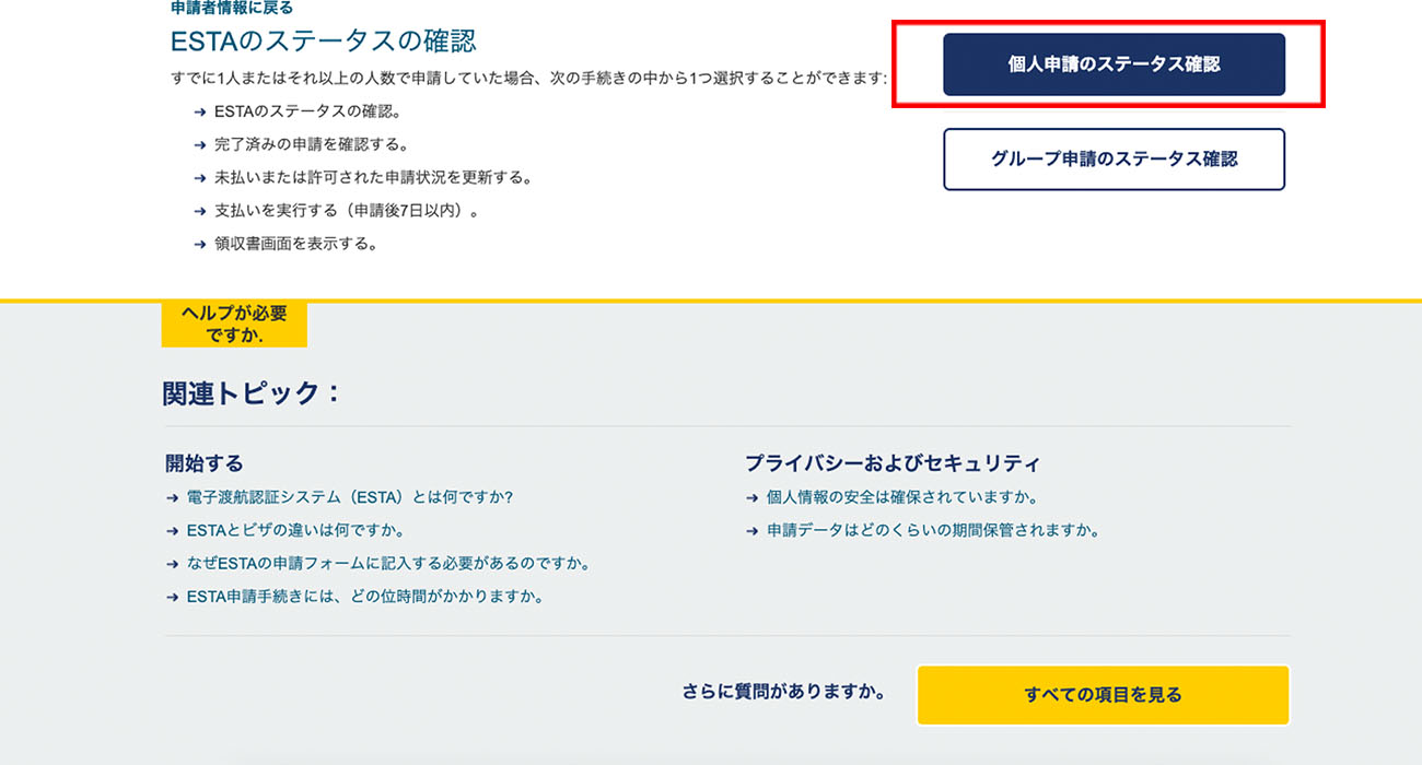 「既存の申請内容を確認」「個人申請のステータス確認」をクリック