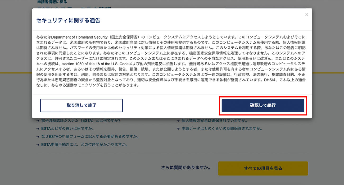 「セキュリティに関する通告」が表示されるので、 「確認して続行」をクリック